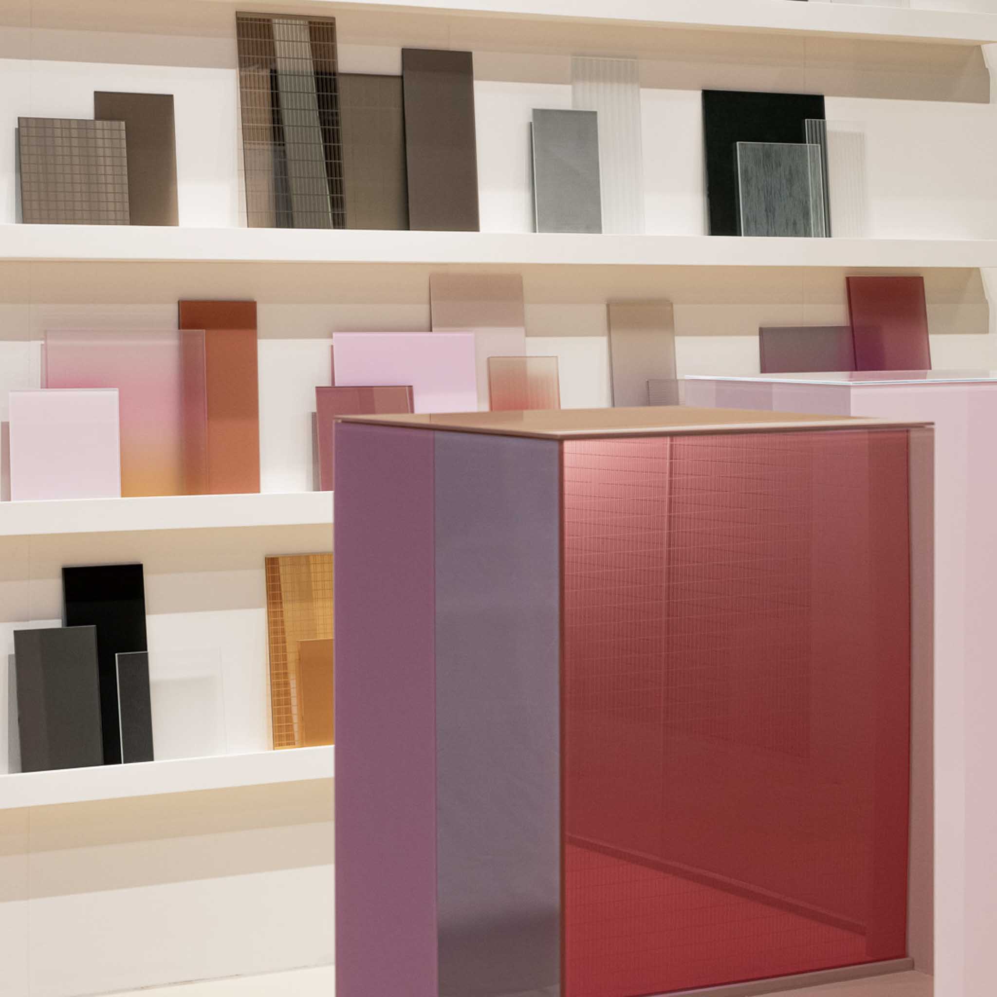 Il vetro colorato laccato specchiante di OmniDecor è disponibile in un’ampia gamma di colori, le cui tonalità sono valorizzate dalla proprietà semi-riflettente della sua superficie.